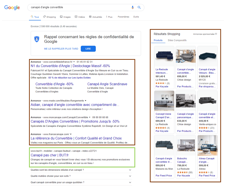 Illustration concrète : tapez « canapé-lit d’angle » dans Google, et les premiers résultats sont des encarts signalés « Annonce » ou « Résultats d’achats ». Ce sont les liens SEA. Ce n’est qu’ensuite qu’apparaissent les résultats organiques issus du SEO.
