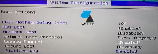 - Désactivez la ligne « Secure Boot » et activez l’option « Prise en charge héritée ».